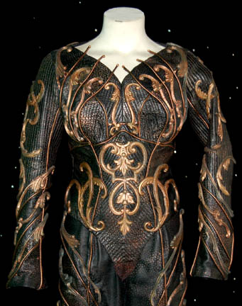 Description: A two piece black costume made from synthetic materials with gold colored molded foam accents applied throughout and painted on details. The costume is made up of jumpsuit pants with suspenders and a matching costume top with long sleeves, and a pair of matching heel boots by ‘Nine West'. The costumer’s tag indicates wear by ‘Jennifer Anderson’ during episode ‘#76’ equivocating to “Zero Hour”, the climatic episode of the third season.