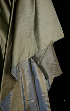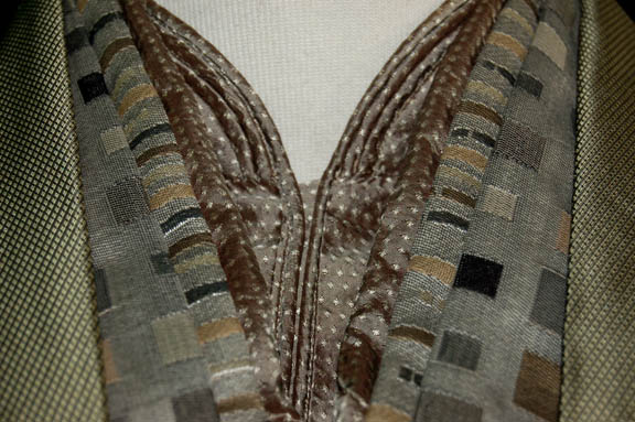 Description: A set of Romulan senator's robes featured in the opening scenes of Star Trek X: Nemesis. This gold themed robe is composed of a Mandarin-style collar dickie with ties in the back, an inner robe with long sleeves, and an outer robe with long bat wing type sleeves. The costume comes with a pair of white cotton shoulder pads, and the three major components are all of similar if not matching fabric patterns.