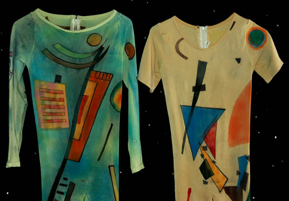 Description: These two colorful circus performer costumes are from an artificial reality created by the Kohl during the Star Trek: Voyager episode “The Thaw” in which “Harry Kim” (Garrett Wang) and “B'Elanna Torres (Roxann Dawson) find themselves in a twisted computer program based on fear. The teal Lycra jumpsuit has long sleeves, a rounded neckline and built in feet while the yellow jumpsuit has short sleeves. They both have brightly colored patterns in multiple colors painted over their entirety. A green felt hat accompanies the teal costume and two gray plastic clown masks worn in the same episode are also included.