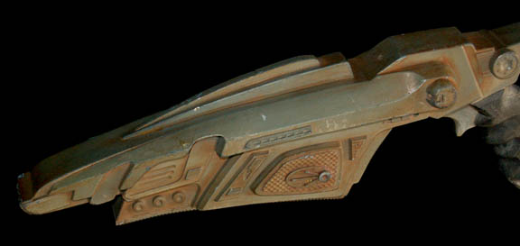 Description: An extremely sturdy cast resin prop phaser rifle featured in various episodes of Star Trek: Deep Space Nine used by Bajoran characters. Painted gray with distress to appear weathered the prop also features molded black rubber components, specifically the hand grip. There are multiple dials and accents making this a very realistic item. Measures approx. 25.5 X 7.25 X 3 inches.