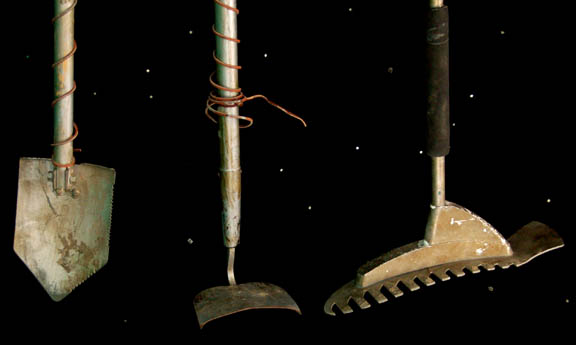 Description: A lot of farming equipment the likes of which could have made appearances in Star Trek: Deep Space Nine's “Children of Time” or any number of other episodes. The lot is a trio of items, a metallic silver painted wood handled shovel with a metal blade, a similarly constructed hoe, and another similarly constructed rake with the exception that is has three settings of black foam grips and two extended metal handles. All three items feature a degree of leather strip wrapping and are distressed to appear used. The items measure approx.: 49 X 15 inches (rake), 51 X 6 (shovel), 54 X 7 inches (hoe).