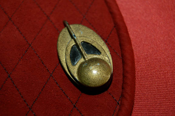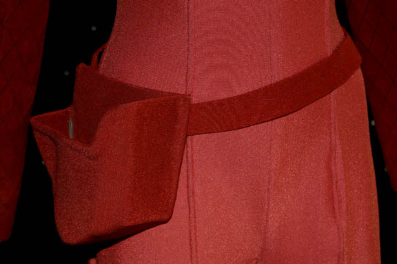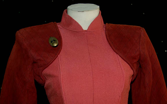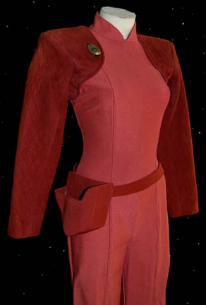 Description: “Kira Nerys” (Nana Visitor) was a Bajoran female who was a Colonel in the Bajoran Militia and later a Bajoran liaison officer on Deep Space Nine. Her Bajoran uniform is a rose color jumpsuit with suede rust color shoulders and sleeves. The suede is stitched with black thread in a diamond motif. The jumpsuit has a zip up the back. Attached to the right side of the chest is a cast resin Bajoran emblem. Also included is a belt and vacuum formed gun holster (gun not included) covered in matching fabric.