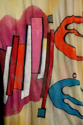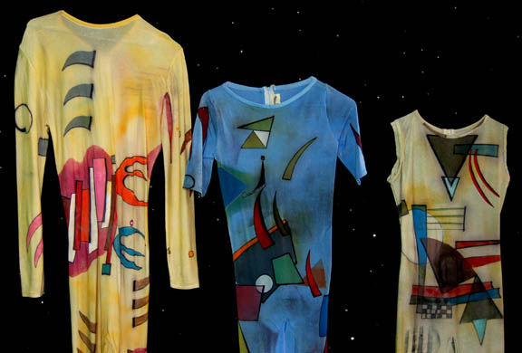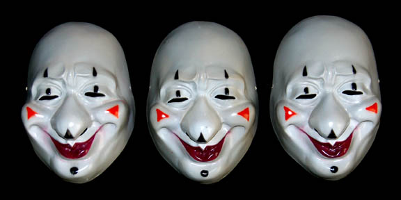 Description: These three colorful circus performer costumes are from an artificial reality created by the Kohl during the Star Trek: Voyager episode “The Thaw” in which “Harry Kim” (Garrett Wang) and “B'Elanna Torres (Roxann Dawson) find themselves in a twisted computer program based on fear. The yellow Lycra jumpsuit has long sleeves, a rounded neckline and built in feet, the blue jumpsuit has short sleeves and the green jumpsuit is sleeveless. They all have brightly colored patterns in multiple colors painted over their entirety. A green stitched hat accompanies the green jumpsuit and a mauve hat accompanies the blue jumpsuit. Three gray plastic clown masks worn in the same episode are also included.