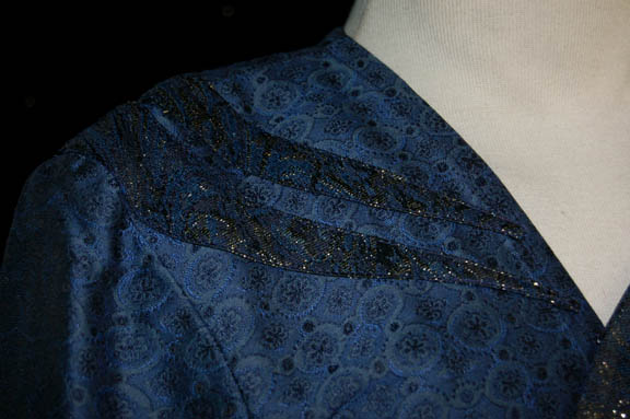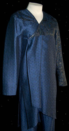 Description: A blue patterned two piece costume featured in the Star Trek: Voyager episode “Prime Factors” with shiny gold colored pattern shoulders and left sleeve. The costumer's tags are inscribed ‘Greg Reeves, Bar #122’, ‘Ronald Guttman #110’, and a sewn in Voyager tag reads ‘Allan Bragg’.