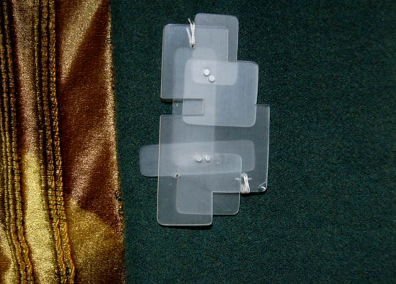 Description: The spacefaring Kressari are primarily known for trading botanical DNA and were featured throughout the Star Trek: Deep Space Nine series. “Zef'No” (Mike Genovese) was a Kressari male who captained the freighter ‘Calondon’ and was seen in the Star Trek: Deep Space Nine episode “The Circle”. The top is ribbed green velvet with dark green felt sections. It has a V-neck, a zip up the back and attached to the left sleeve are two embellishments. One is multiple layers of opaque geometric acrylic and the other is a metal triangular design with an eye in the center. Worn over the top is an olive green leather harness that snaps together. Costume comes complete with costume tag.