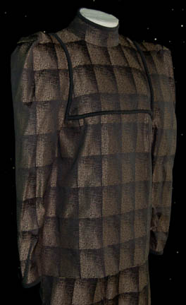 Description: The Romulans are a warrior civilization from the planets Romulus and Remus who founded their Romulan Star Empire two thousand years ago. This costume was worn by a “Romulan Senator” in the Star Trek: Deep Space Nine episode “Inter Arma Enim Silent Leges”. The top is made of black and brown patterned fabric with black piping around the chest and collar and a zip up the back. Removable sleeves are worn over the top that also have black piping around the shoulders. Matching pants accompany the outfit complete with black suspenders and stirrups. Costume comes with costume tag.