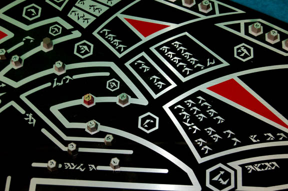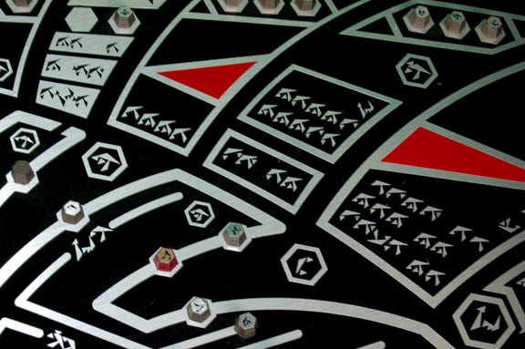 Description: The Son'a are a humanoid race descended from the Ba’ku who are known for their egotistical and materialist nature. They were featured prominently in Star Trek IX: Insurrection where they were fighting a loosing battle to overcome the affects of aging without access to the regenerative effects of the Ba’ku planet’s metaphasic radiation. This is an extra large black acrylic computer interface panel with silver and metallic red application accents made to section out the panel into differing modules. There are other metallic silver applications used as ‘Son’a’ character letters on both the panel and the adhered raised plastic buttons. A raised triangular surface is also present with similar features. Several of the buttons have been lost to time however there are so many, it’s difficult to tell where they’re missing! Measures approx. 51 ½ x 30 inches.