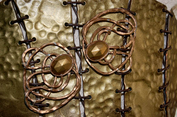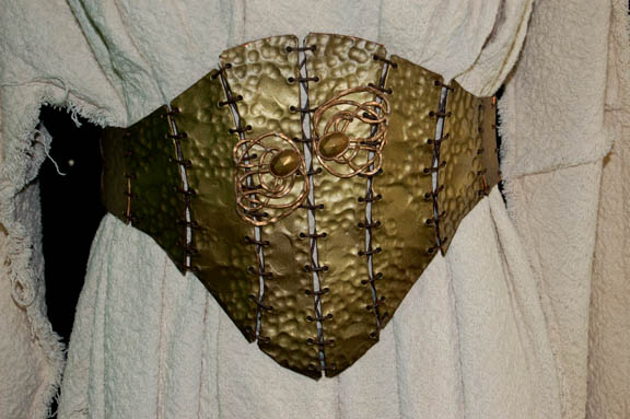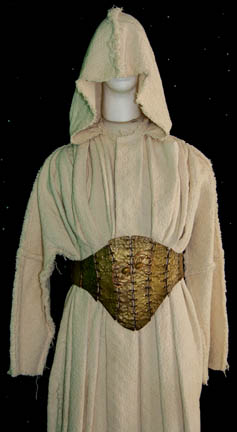 Description: This is the costume of the playwright “Kellis” (Joseph Will) who aided “B'Ellana Torres” (Roxann Dawson) upon her crashing on his planet. In return for stories of her travels and adventures he provided her with food and repair making materials and their combined efforts of storytelling averted a war between a local warlord and a neighboring tribe. The costume is a practical cream colored robe featured in one of the plays, appearing multi-layered with a corresponding brass corset with attached accents. The costumer’s tag indicates wear by ‘Joseph Will’.