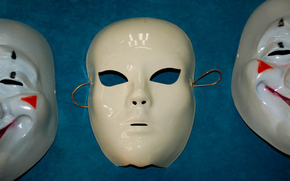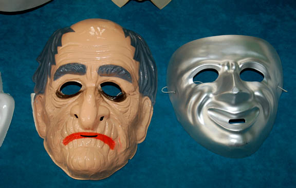 Description: This lot of thirteen masks belonged to circus performers from an artificial reality created by the Kohl during the Star Trek: Voyager episode “The Thaw” in which “Harry Kim” (Garrett Wang) and “B'Elanna Torres (Roxann Dawson) find themselves in a twisted computer program based on fear. Twelve of the masks are plastic while the black and white mask is rubber. The twelve masks include three white faces with ears, three grey clown faces, two silver variations, one white without ears, one cream, one old man and one colored face with ears.