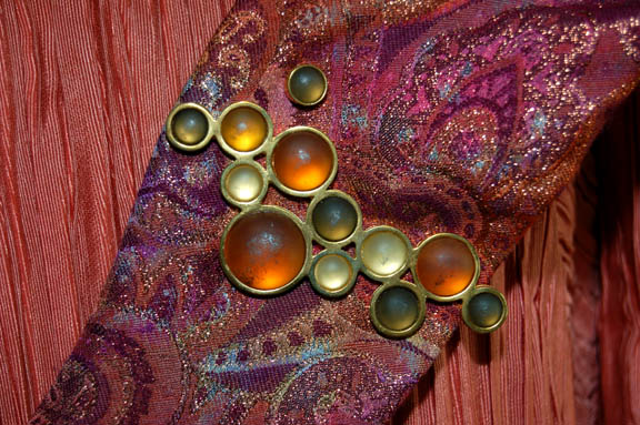 Description: A costume featured in the Star Trek: Deep Space Nine episode “The Forsaken” in which a group of ambassadors visit “Deep Space Nine” and find themselves at the mercy of their hosts when an alien computer causes problems. The costume is that of “Ambassador Taxco” (Constance Towers) and is an apricot dress and faille, crinkle pleat with a metallic gold sparkle shoulder drape with a nice pattern. The costumer's tag reads ‘The Forsaken, Taxco, Constance Towers’.
