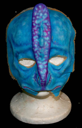 Description: This interesting blue and purple alien prosthetic was made for the filming of Star Trek episodic television. The actual prosthetic is the same as the alien creature featured in the Star Trek: Voyager episode “The Voyager Conspiracy”, however the episode alien is tan and brown as opposed to blue and purple. This may have been a study for the alien however the tanned version was chosen instead.