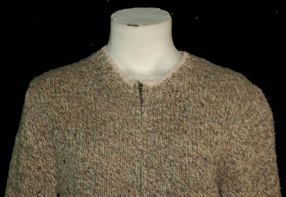 Description: A gray knit zip front sweater featured in the Star Trek: Voyager episode “The Killing Game, Pt. I”, wherein “Voyager” is captured by the Hirogen and forced to enact holodeck scenarios as hunter training. “7 of 9” (Jeri Ryan) and other crewmembers are placed in a World War II environment where they must play French resistance members against Nazi Hirogen, “7 of 9” wears a costume featuring this sweater. The sewn in Deep Space Nine tag is inscribed ‘Jeri Ryan'.