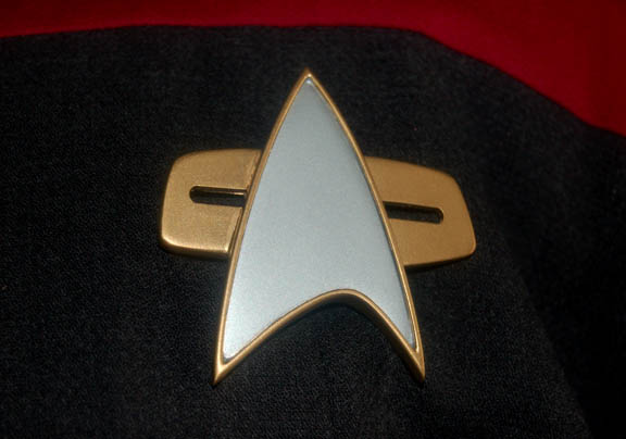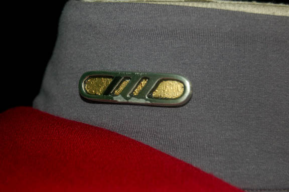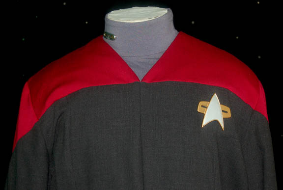 Description: A ‘fake' Starfleet command red division uniform jumpsuit featured in the Star Trek: Voyager episode “Live Fast and Prosper” for wear by “Zar” (Francis Guinan), an alien con man who ‘admitted’ aliens into the ‘Federation’ by accepting payment. His costume is a mock up of a standard Starfleet uniform and he used it to portray “Voyager” first officer “Commander Chakotay” (Robert Beltran). It is a dark gray uniform jumpsuit with command red division shoulders and an oversized Maquis provisional rank pin depicting ‘lieutenant commander’, with an oversized resin Starfleet combadge painted metallic silver and gold. The gray yoke turtleneck is attached to the costume itself and not a separate. The costumer’s tag reads ‘Zar, Francis Guinan, Fake Chakotay look’, and the costume comes with a second oversized provisional ‘lieutenant commander’ rank pin.