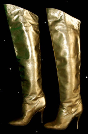Description: Being a 1960's jet setting international super spy means at least as much pleasure as business, even in the holodeck. For “Special Agent Julian Bashir” (Alexander Siddig) it means interacting with Russian counter intelligence agents, hit men, and go go dancers. This costume is a two piece gold fringe pantie and bra set featured in the Star Trek: Deep Space Nine episode “Our Man Bashir”. The costume also comes with a pair of knee high gold heel boots and the garment features a sewn in Deep Space Nine tags reading and a costumer’s tag reading ‘Pam DeMarche’.