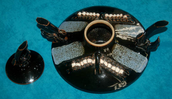 Description: The Orions are a humanoid species with distinct green skin from the Orion planet. They were featured throughout the Star Trek universe however this specific ornament was onboard the Orion slave trader “Harrad-Sar's” (William Lucking) ship during the Star Trek: Enterprise episode “Bound”. Made of hand sculpted ceramic the piece has been glazed black and brown with a dripped sky blue design. The handles curve ornately to each side as well as on the removable lid. On each side are white ceramic accents for detail. Measures approx. 16 ½ x 13 x 12 inches.