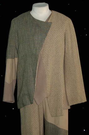 Description: A costume featured in the Star Trek: Voyager episode “Day of Honor” for wear by Alan Altshuld in his portrayal of ‘Lumas', an alien whose species was assimilated into the Borg Collective. The costume consists of a full length sleeveless jumpsuit and a matching asymmetrical waistcoat. The costumer’s tags indicate wear in the episode and sewn in Voyager tags indicate further wear by various actors.
