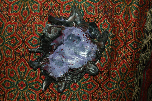 Description: A costume featured in the Star Trek: Deep Space Nine episode “Taking Into the Wind” worn by “Luaran” (Kitty Swink), a Vorta ship commander killed by “Garak” (Andrew Robinson). The costume is made up of a soft green velour sleeveless jumpsuit with an elaborately patterned costume top with a suede shoulder accent and a molded special effects disruptor wound sewn onto the belly. The costumer's tag reads ‘Kitty Swink’.