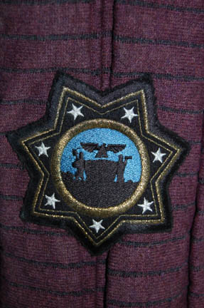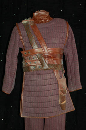 Description: Appearing in the episode “Detained” of Star Trek: Enterprise this costume is made up of several parts; purple quilted pants with black inset lines and black elastic stirrups and suspenders, a matching coat with brown leather accents and a ‘Tandaran' patch on each sleeve forearm, and a leather neck wrap with attached shoulder pads. There is also a leather quadruple belt and a harness with a holster for a ‘shock stick’ (sold separately). The costume was worn by Vince Deadrick who appeared frequently on Enterprise as a stunt performer, and dust from the stunts is still present.