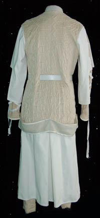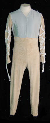 Description: “Captain Archer” (Scott Bakula) and “Commander Shran” (Jeffery Combs) have traveled to the Aenar city in an attempt to discover the source of Romulan attacks using a strange alien ‘telepresence' known only to the secretive tribe. Believed to be a myth until they showed themselves to the Andorian government, the Aenar have lost one of their tribe to sinister Romulan agents who have kidnapped him in the episodes “United” and “The Aenar”. This costume is that of an ‘Aenar physician’ who helps to heal “Shran” after he takes a bad fall in the episode. The costume is a jumpsuit with fur pants and sleeves, a suede and wool; diamond pattern ‘lab coat’ goes on over that with half sleeves and a white belt with a metal buckle. The costumer’s tag is inscribed ‘Robert Schwertzer’.