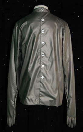 Description: This fascinating surgical scrubs coat was worn by “Captain Archer” (Scott Bakula) in the Star Trek: Enterprise episode “A Night in Sickbay”. He wore it while he was in “Dr. Phlox's” (John Billingsley) sickbay helping him perform surgery on his pet beagle “Porthos” (Breezy). Made of silver vinyl, this surgical costume has built in gloves with discreet zips at the wrists to allow the wearer ease of use, and metal silver snaps up the back.