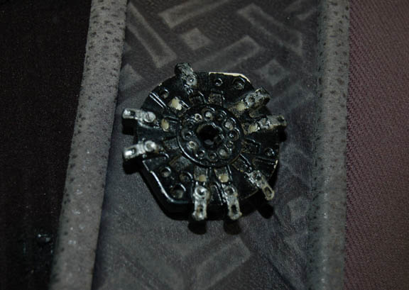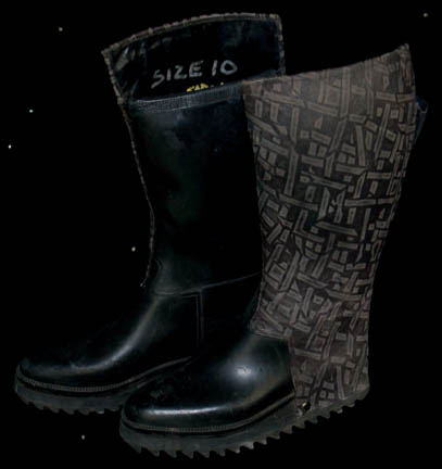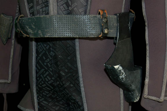 Description: A Jem'Hadar uniform made for episodes of Star Trek: Deep Space Nine and appearing in episodes of Voyager like “The Killing Game, Parts I and II”. The costume is made from neoprene components and comes with a sleeveless jumpsuit with gray pants and a Velcro sealing flap pocket on the left thigh and stirrups to fit inside accompanying boots; A black and gray neoprene vest with a zip up the center; a uniform jacket with an off center zip and Velcro placements for included resin accents. The jacket features attached leather belt keepers for the vinyl belt with plastic holster for an energy pistol (sold separately). This incredible costume features a costumer’s tag and sewn in Voyager and Deep Space Nine tags indicating wear by various actors in multiple episodes.