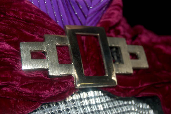 Description: An elaborate costume featured in the Star Trek: Voyager episode “Bride of Chaotica” in which “Voyager” encounters a layer of subspace including aliens who start a war with the holodeck characters created by “Tom Paris” (Robert Duncan McNeil) who portrayed “Captain Proton” in the program. The costume is that of a soldier within ‘Chaotica's Army of Evil’ made up of several components; a full length purple jumpsuit with shiny silver striping running horizontally down the fabric, a matching hood that covers the eyes, a silver colored metallic dickie that covers the shoulders and neck meant to appear as chain mail, a black leather belt with a V-shaped ‘buckle’ and a holster, a pair of oversized gloves that extend up the forearm, a set of outer layer trunks colored purple and black, and an impressive purple velour cape with a black lining featuring shiny gold flours-de-les and a silver colored metal broach. The costumer’s tags read ‘Mark Hoffman’ and ‘Lonzak’s Henchmen’.