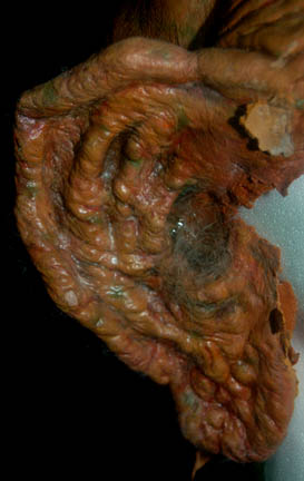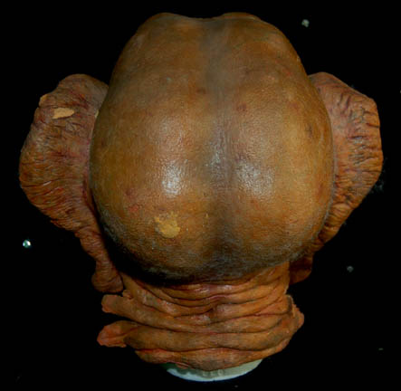 Description: This incredible piece was used to create the appearance of the Ferengi “Grand Nagus”; the leader of the Ferengi Alliance during the Star Trek: Deep Space Nine series. His prestigious role grants him political as well as economic leadership of the race. Although there are at least six known Grand Naguses, this specific style of head application was only used on two of them; “Gint” (Max Grodénchik) who was the first Ferengi Grand Nagus featured in the DS9 episode “Body Parts”, and “Zek” (Wallace Shawn) who was the Grand Nagus for most of the 24th Century and appeared in seven DS9 episodes including “The Nagus” and “Rules of Acquisition”. It is most likely this piece was worn by Zek since he had the most appearances as the Grand Nagus. The application features the customary large Ferengi lobes with delightful hairy centers and a wart on the forehead! It's been painted to show skin texture and detail over its entirety. Due to time, use and storage, the application has some damage around the ears and back of the neck. There is also some residual white fuzz around the back of the head due to previous storage conditions however with some time and patience this should be able to come off. It’s truly an impressive piece for any Ferengi or Star Trek fan!