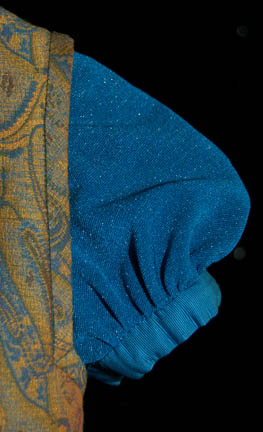 Description: A pair of costumes made for Scarlett Pommers in her portrayal of “Naomi Wildman” in the episode “Infinite Regress” of Star Trek: Voyager comprising a pair of blue jumpers with puff sleeves and a pair of blue paisley vests. The sewn in Voyager tags on the costumes read ‘Scarlett Pommers', and ‘Britney Escoto’ and the costumer’s tag indicate wear.