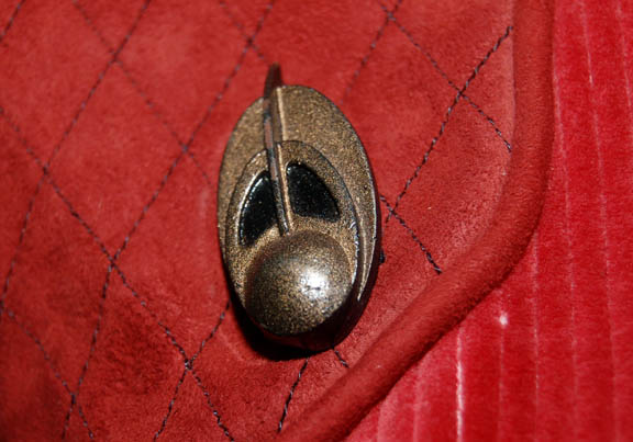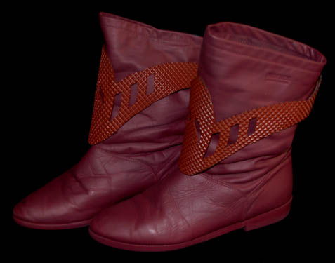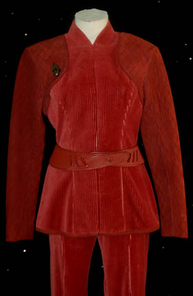 Description: A costume made for actors portraying Bajoran soldiers on Star Trek: Deep Space Nine. The costume is rust colored corduroy trousers and a matching jacket with black diamond thread patterned suede sleeves. The costume comes with a matching vinyl belt, a pair of matching painted leather boots with vinyl accents, and a bronze and black painted metal Bajoran combadge for the right breast. Sewn in Deep Space Nine tags indicate use by various actresses.