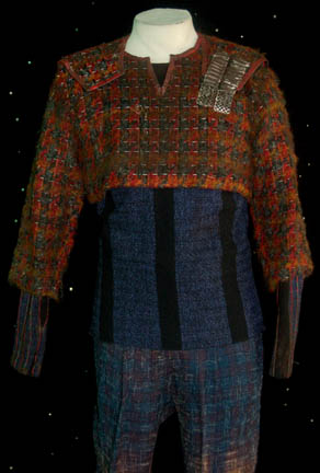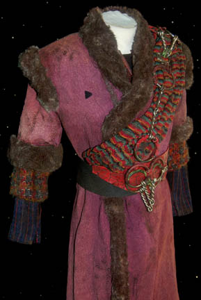 Description: A costume featured in the Star Trek: Voyager episodes “Lifesigns” and “Dreadnaught” for wear by “Lorrum” (Michael Spound), a member of the Kazon-Nistrim sect in collusion with “Seska” (Martha Hackett). His costume is composed of a blotchy blue woven trousers and a red lined blue and black woven shirt over which is worn a cropped woven multi-colored jacket with molded rubber and metal accents at the neck. The outer coat is distressed mauve suede with bunched fur lining on the sleeves, the shoulders, and down the neck. The costume is finished off by an elaborate rubber belt and knitted multi-color sash with a variety of unattached metal accents. The costumer's tag indicates wear in the episode “Lifesigns” and indicates further use by other actors.