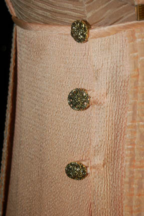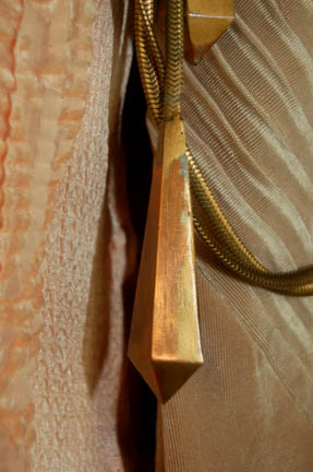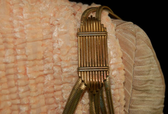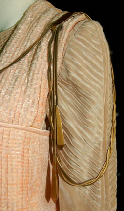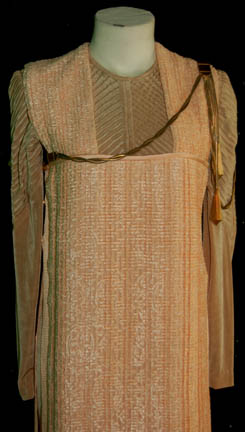 Description: A gold colored costume featured in the Star Trek: Voyager episode “Emanations” for wear by a “Vhnori” alien. The costume is a jumpsuit with pleated sleeves to appear ribbed and a pink rose colored overdress featuring a bronze colored metal wound chain accent hanging from one shoulder and draping across the chest where it is affixed. The costumer's tag reads ‘Chad Valchar’.