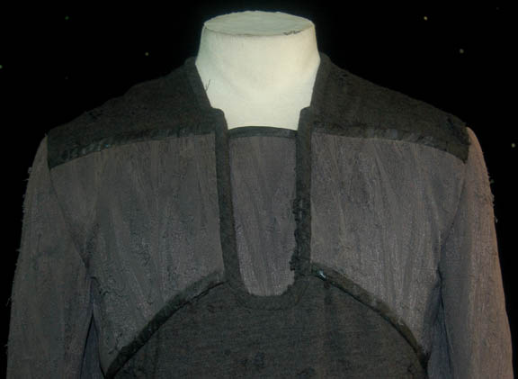 Description: A costume top featured in the Star Trek: Deep Space Nine episode “Second Skin” for wear by “Corbin Entek” (Gregory Sierra), agent of Cardassia's Obsidian Order. The costume is a charcoal colored top with gray sleeves and chest made from neoprene and it zips up the back. The item has at some point been distressed to appear damaged with a significant degree of minor tears and thrashing taking place throughout. The sewn in Deep Space Nine tags indicate wear by ‘Gregory Sierra’ and multiple actors, and the costumer’s tag reads ‘DS9 “Second Skin”, ENTEK, Gregory Sierra’.