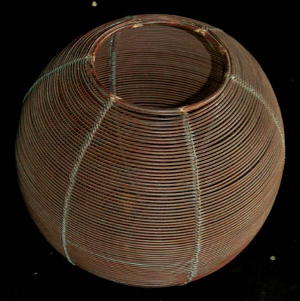 Description: This diverse set of three containers was used as set dressing during the filming of Star Trek episodic television. One is woven wood strips around a wire frame with a piece of rubber covering the opening in the top. The second container is a sphere made of wire with sea foam green painted trim and the third is a woven metal basket with adjustable handles. The largest basket with handles measures approx. 8 ΒΌ x 12 inches diameter.