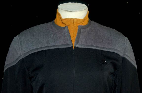 Description: A Starfleet uniform jumpsuit featured in various seasons 5-7 episodes of Star Trek: Deep Space Nine for wear by “Nog” (Aaron Eisenberg). The costume is a full length black jumpsuit with gray quilted shoulders and operations gold division stripes at the cuffs. The costume features a form fitting elastic waist with sewn in loops for ‘away team' gear and zips up the front. The costume also comes with an operations gold long sleeved turtleneck undershirt. Both items feature sewn in tags reading ‘AARON’.