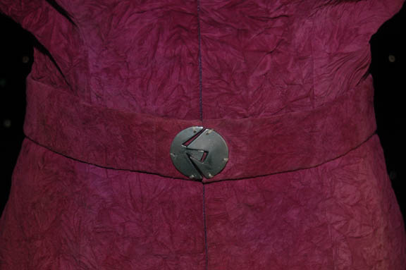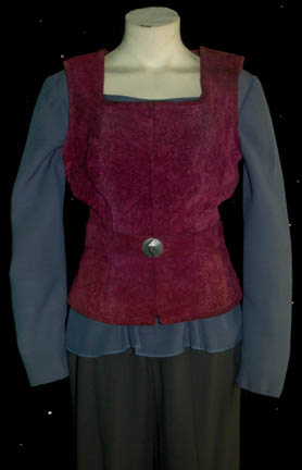 Description: A costume featured in the Star Trek: Deep Space Nine episode “The Siege”. Following the evacuation of station personnel due to a take over by radical elements within the Bajoran military, the Starfleet crew of “Deep Space Nine” dons civilian clothes while thwarting the invaders. “Jadzia Dax” (Terry Farrel) escapes to warn the Bajoran government of the threat posed by the military in this costume, a sage colored pair of pants, a blue long sleeved shirt with a squared off neckline, and a purple suede vest. The costume comes with a total three costumer's tags indicating use in the episode and all three garments feature sewn in Deep Space Nine tags reading ‘Terry Farrel’.
