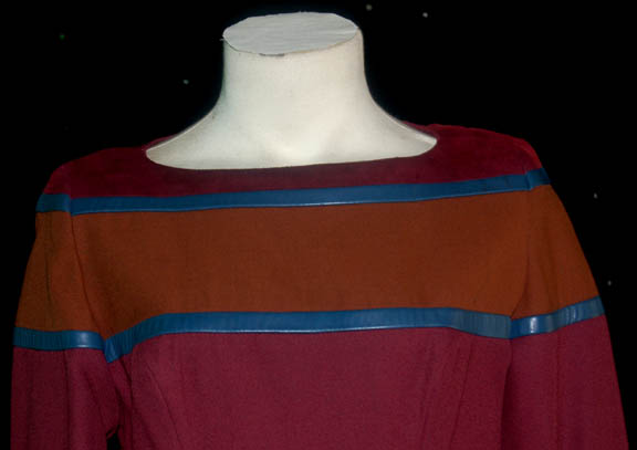 Description: A costume featured in the Star Trek: Voyager episode “Cold Fire” wherein “Voyager” arrives at the location of a second ‘Caretaker Array' housing thousands of Ocampa who are older than expected. The Ocampa wear costumes like this one, a pair of tan trousers, a red tabard with gray leather strips bordering a tan stripe across the chest and around the shoulders. The costumer’s tag reads ‘Cold Fire, Cindy Howe’.