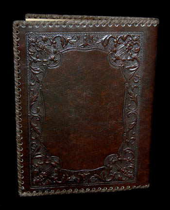 Description: This interesting prop was used during the filming of Star Trek episodic television and/or Star Trek feature films. It's a brown faux leather binder with a raised Fleur De Leis emblem on the front, gold detail and bound trim. Inside are two attached unused pads of paper. Measures approx. 12 ½ x 9 ½ inches.
