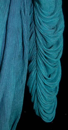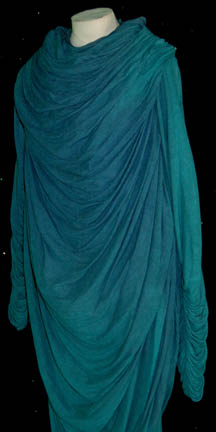 Description: A costume featured in various episodes of Star Trek: Deep Space Nine for wear by background actors portraying a “Blue Fat Alien”. The costume is a large draping gown with stripe textured fabric, pleating in the front to create a paired ribbed draping effect on the chest and sleeves, an oversized hood with an extended tail, and a pair of matching trousers. The costume shows evidence of small holes near the hem of the dress and the costumer's tag reads ‘Blue Fat Alien, Will Fit anyone’.
