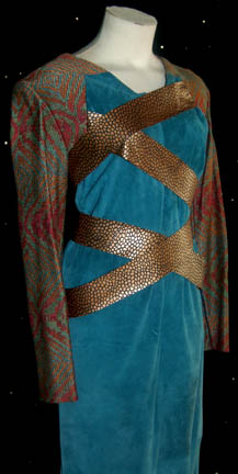Description: A costume featured in various episodes of Star Trek: Deep Space Nine for wear by background actors portraying a ‘Promenade Alien'. The costume is a blue suede jumpsuit with a faux reptile skin belt with gold scales, and patterned sleeves. The costumer’s tag indicates wear by ‘Omega Cuellar’.