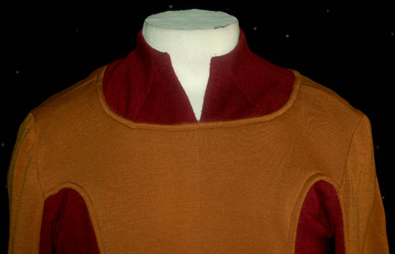 Description: A costume jumpsuit featured in multiple Star Trek: Deep Space Nine episodes made from brown and maroon wool. The costumer's tag reads ‘Bajoran Waiter’ and is stamped ‘DS9’.