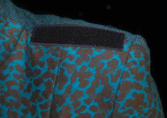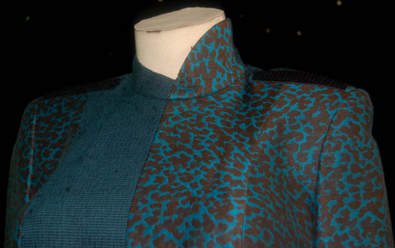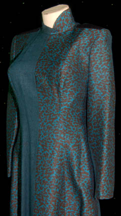 Description: A costume featured in the Star Trek: Deep Space Nine episode “Dax” for wear by actress Fionnula Flanagan in her first Star Trek appearance as “Enina Tandro”. The costume is a dress, teal and black with a teal drape. The costumer's tag reads ‘DS9 408 “Dax” and indicates wear in the episode.