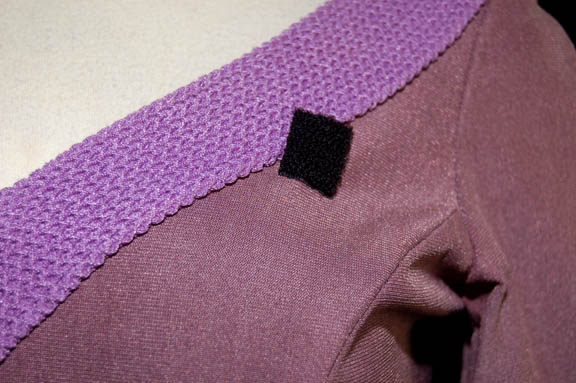 Description: A casual jumpsuit featured in various episodes of Star Trek: The Next Generation for wear by “Councilor Troi” (Marina Sirtis) with corresponding purple died boots. The jumpsuit is form fitting spandex with a low cut bust and a light purple trim around the neck where is sewn on a Velcro placement for a Starfleet combadge (sold separately), the boots zip up the inside with solid heels. Both feature costumer's tags reading ‘Marina’ or ‘Marina Sirtis’ and ‘Troi’.
