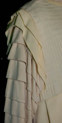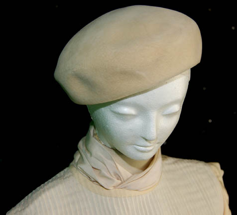 Description: Riva's Chorus was a group of three telepaths that attuned the famed mediator “Riva’s” (Howie Seago) thoughts and emotions since he was deaf. They were featured in the Star Trek: The Next Generation episode “Loud as a Whisper”. This costume was worn by the “Scholar / artist” since each member of the trio spoke for different aspects of Riva. The costume includes a cream tunic with a pleated chest and ruffled sleeves. The pants are cream with snaps at the ankles to create a pleat in the leg. The cream beret is soft felt. Costume comes complete with costume tag.