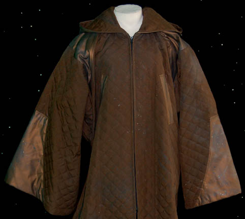 Description: This costume was worn by a bar alien during the Star Trek: Enterprise episode “The Seventh” in which “T'Pol” (Jolene Blalock) asks “Captain Archer” (Scott Bakula) to go on a covert mission to capture a fugitive who had avoided the Vulcan High Command for over twenty years. The costume is a large brown quilted overcoat with vinyl trim and a hood. It zips up the front and there is intentional paint splatter on the sleeves.
