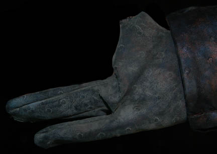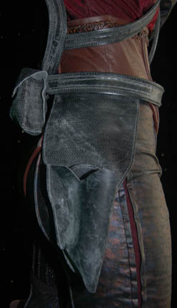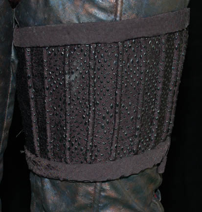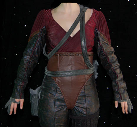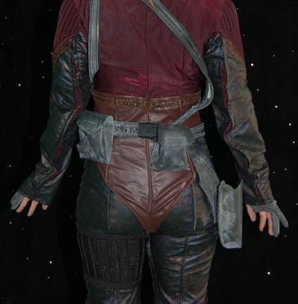 Description: “Tarah” (Suzie Plakson) was a female Andorian in the Andorian Imperial Guard who almost killed the Vulcan “Soval” (Gary Graham) in the Star Trek: Enterprise episode “Cease Fire”. Luckily for Soval, “Captain Archer” (Scott Bakula) managed to stop her. This costume was worn by Tarah's stunt double. The jumpsuit is metallic copper and blue vinyl with a crimson chest, shoulders and striped accents down the limbs. Around the waist is a brown vinyl midsection, the shoulders are pleated and there is brown cross stitch trim. Worn over the jumpsuit is a black and gray harness with two pouches and a gun holster attached. The harness needs repairing in the back. The accompanying knee high boots are heeled black leather with accents over the toes and around the top section. Also included are black gloves with two fingers. Costume comes complete with costume tag.