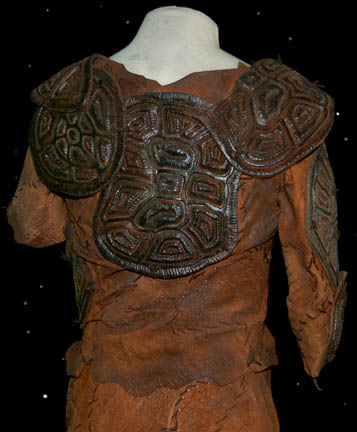 Description: The ‘Novans' are a colony of humans living on the planet Terra Nova who were investigated by Captain Archer (Scott Bakula) and his away team during the Star Trek: Enterprise episode “Terra Nova”. Both the pants and cropped top are made of brown roughly cut leather pieces that have been hand stitched together. Attached to the legs, arms and shoulders are pieces of sculpted latex that have been painted brown to resemble thick leather. The accompanying shoes are made of Neoprene covered in brown hand stitched leather with faux leather latex pieces attached on top. Costume comes complete with costume tag indicating wear by “Athan” (Brian Jacobs); a Novan who distrusted “Captain Archer” (Scott Bakula).