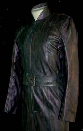 Description: The Vulcan Zombies were seen in the Star Trek: Enterprise episode, “Impulse” where Vulcans onboard their ship Seleya had lost control of their emotions due to Trellium-D poisoning. The costume is made of black vinyl with green, black and brown paint dripped over its entirety to give the impression of spilled liquids and disorder. It zips up the front and has removable black shoulder pads. It comes complete with a matching belt and a distinctly Vulcan resin buckle that attaches with Velcro. Costume comes complete with costume tag.