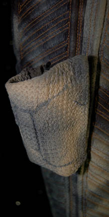 Description: The “Arkonian's” are a reptilian humanoid species featured in the Star Trek: Enterprise episode “Dawn”. “Zho’Kaan” (Gregg Henry) was a crewman onboard the Arkonian destroyer that worked with “Captain Archer” (Scott Bakula) and the Enterprise so they could both locate their missing crewmen. This costume was worn by the stunt double and is a long sleeved jumpsuit made of neoprene covered with camouflage green fabric and raised chevron ribbing on the sides and sleeves. There is a zip up the front and loops on the side for the accompanying gun holster to attach. Costume comes complete with costume tag.