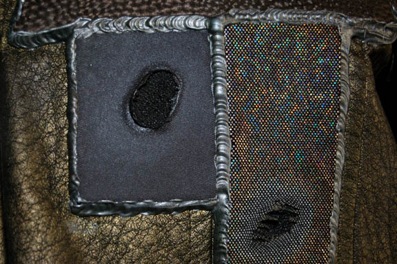 Description: The Retellians are a humanoid race with distinctive ridges to their nose, forehead and chin. They were featured in the Star Trek: Enterprise episode “Precious Cargo” in which the Retellian “Firek Goff” (Scott Klace) and his brother attacked a “Krioian transport” ship. This costume was worn by renowned stunt actor Vince Deadrick in the stunt role of Firek Goff. It includes a metallic green vinyl jacket with ribbed rubber components and neoprene sections. Intentional distress marks are sporadically placed over the surface. Worn underneath is a sleeveless metallic green vinyl jumpsuit also with neoprene components and intentional distress. Costume comes complete with costume tag.