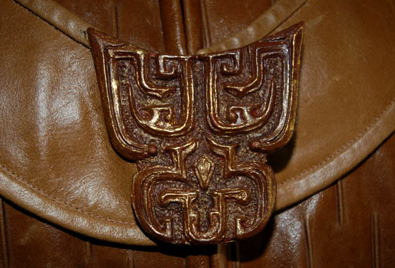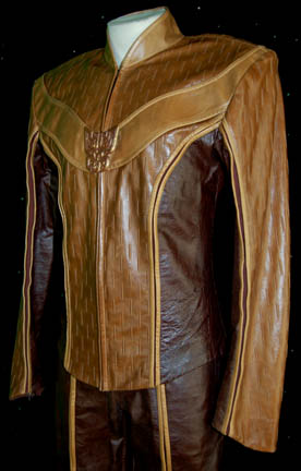 Description: This great costume was made for a Vulcan in the Star Trek: Enterprise episode, “Carbon Creek”. The jacket is made of brown and tan leather with a broken-line pattern on the tan sections. There are also tan pleats down the sleeves. It zips up the front and has a cast resin Vulcan medallion on the breastbone painted brown and gold. The matching pants are lined brown leather with tan pleats down the front and back of each pant leg. They are held up with attached black elastic suspenders and have brown elastic stirrups on each foot. Costume comes complete with costume tag.